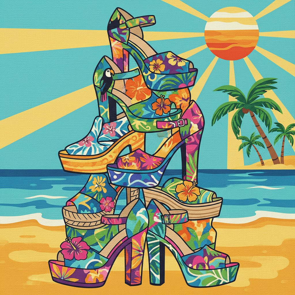 Transform your space with this vibrant Sunlit Tropical Shoe Tower Paint By Numbers masterpiece. This unique design captures stacked vintage sneakers basking in golden sunset lighting, creating a perfect blend of pop culture nostalgia and tropical paradise vibes.