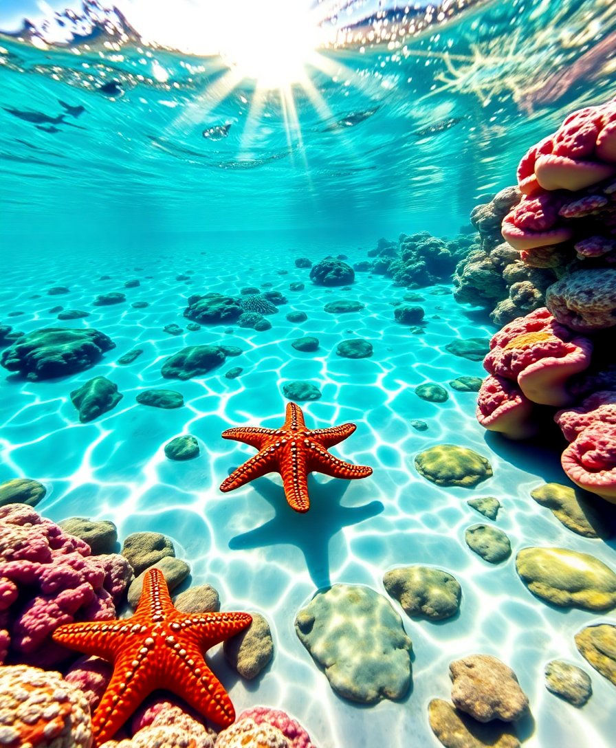 Ultimately, step back and admire your finished tropical masterpiece. The sunlit waters and realistic starfish create a captivating focal point. Your completed artwork becomes a window to peaceful ocean depths that soothes and inspires.