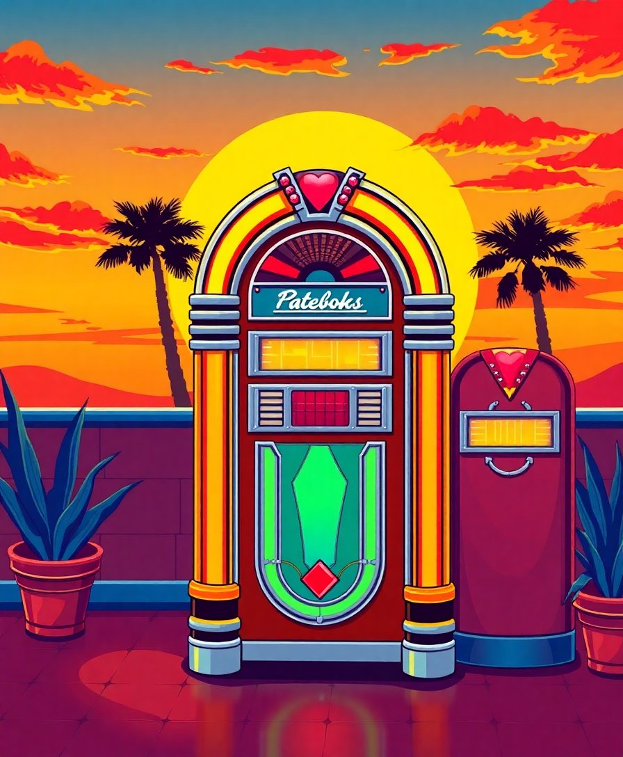 The unique combination of vintage jukebox elements with sunset tropical atmosphere creates stunning visual impact. The neon accents and warm color palette capture authentic retro diner vibes perfectly.