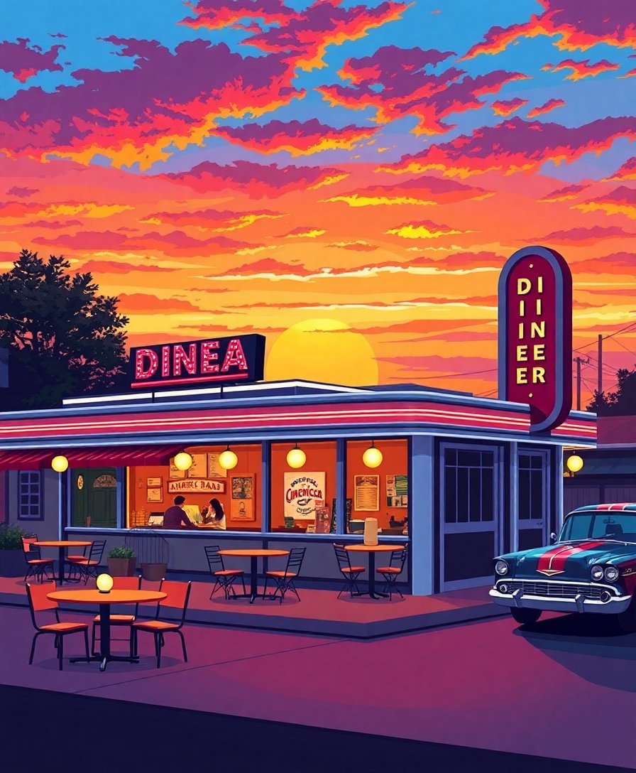 Transform your space with the nostalgic charm of the Sunset Over Americana Diner Paint By Numbers kit. This captivating artwork combines warm sunset hues with classic American diner aesthetics. Additionally, this unique design celebrates vintage pop art styling through numbered painting sections.