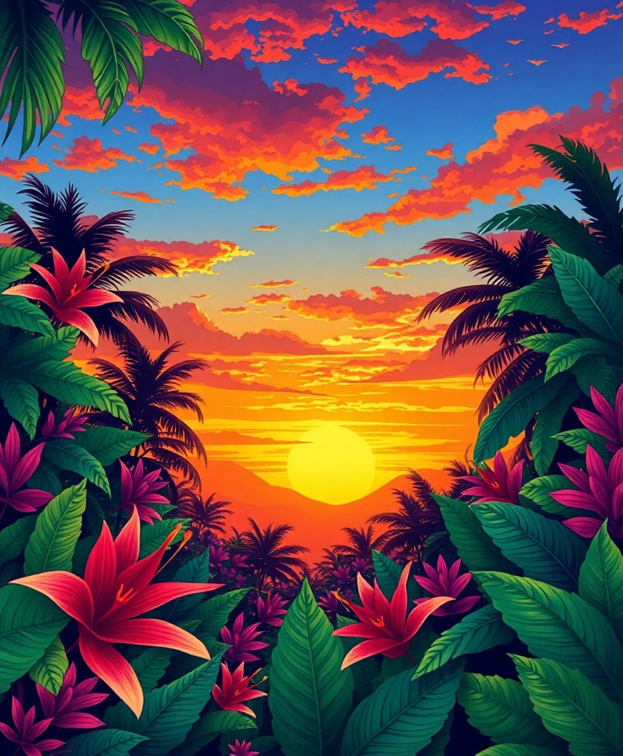 Ultimately, step back to admire your completed tropical paradise. The warm sunset glow contrasts beautifully against rich green vegetation. Your finished piece radiates tranquil energy perfect for any living space.