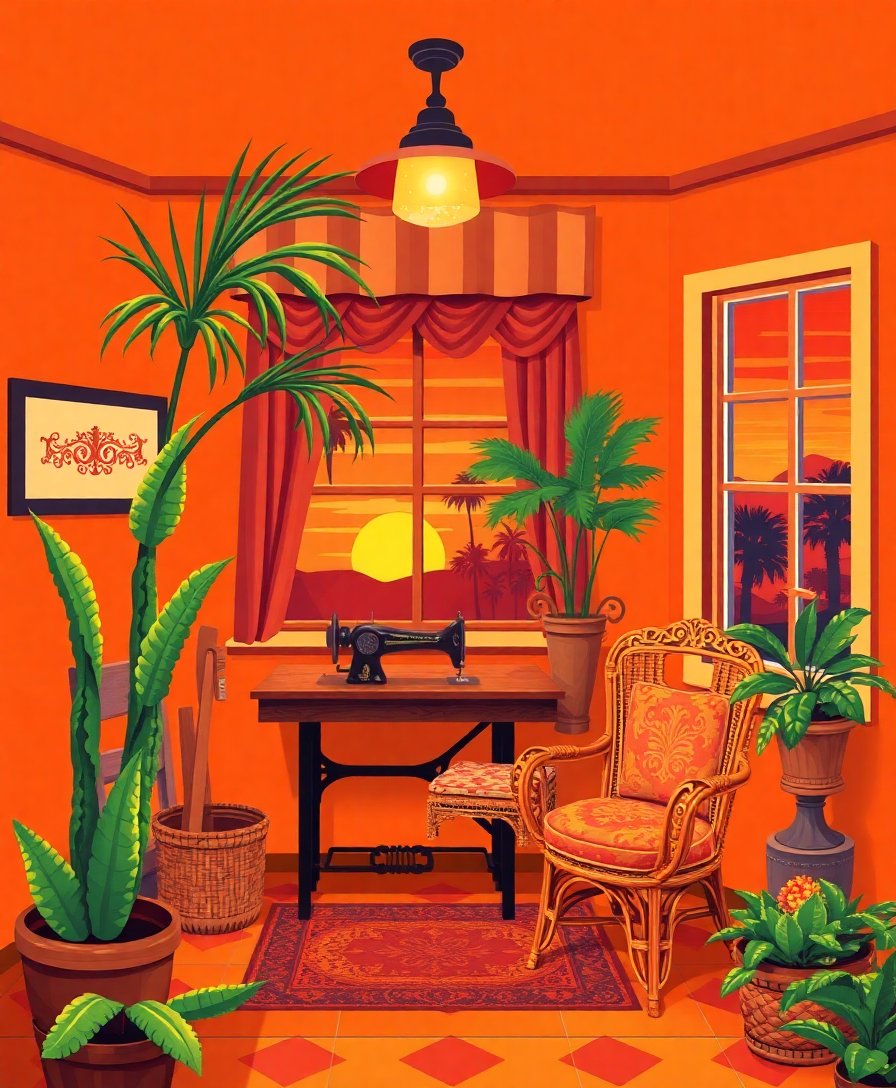 The warm sunset lighting and realistic palm details create an authentic heritage atmosphere. This cozy indoor scene celebrates traditional sewing rooms with nostalgic charm.