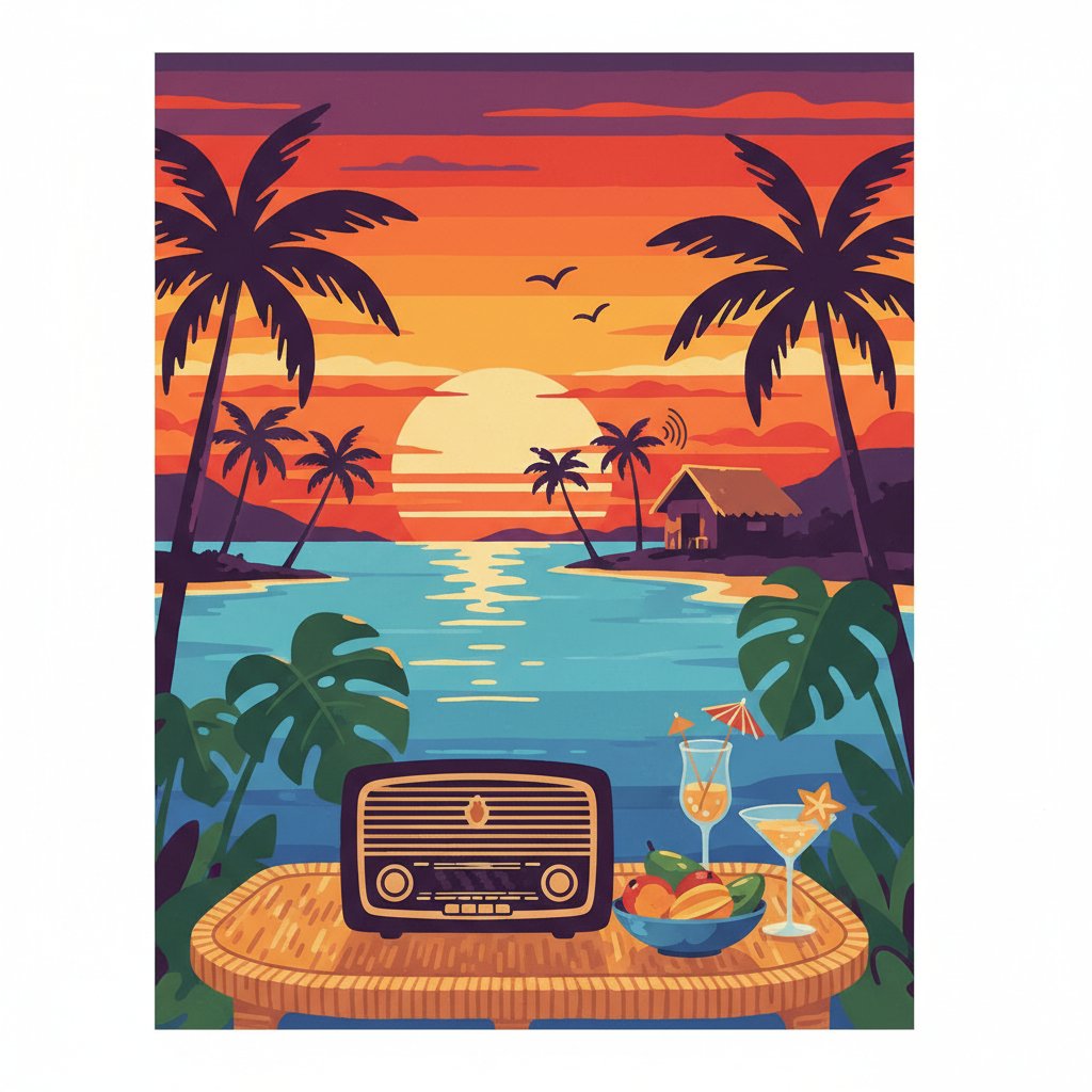 Ultimately, step back and admire your finished masterpiece. Therefore, you’ve created a stunning tribute to vintage broadcasting that radiates tropical warmth. Your completed artwork captures the essence of golden hour entertainment perfectly.