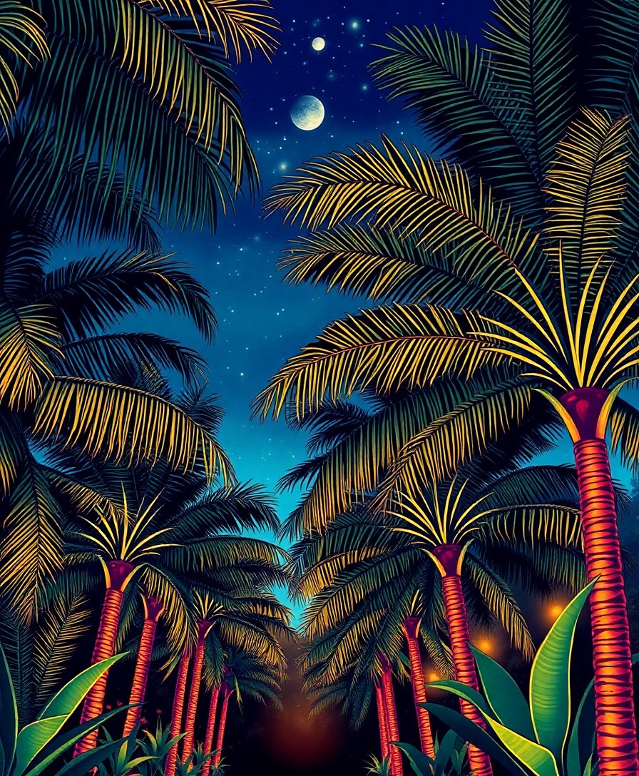 Transform your space with the enchanting Swaying Vintage Night Canopy Paint By Numbers. This nostalgic artwork captures swaying palm fronds beneath a mesmerizing evening sky. Moreover, this kit brings vintage coastal charm directly to your home.
