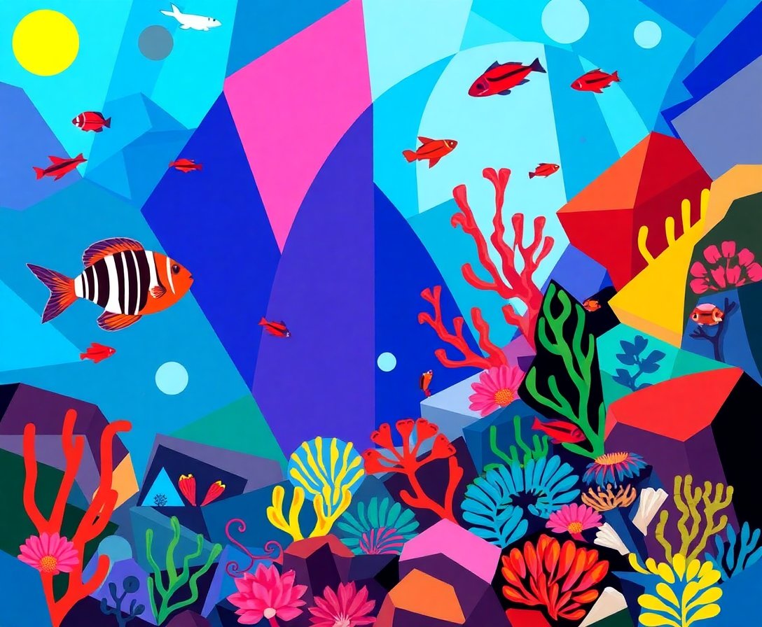 Ultimately, witness your vintage-inspired reef come alive through bold geometric forms. Furthermore, the finished piece showcases stunning tropical elements in striking cubist style. Indeed, your completed artwork becomes a conversation-starting focal point.