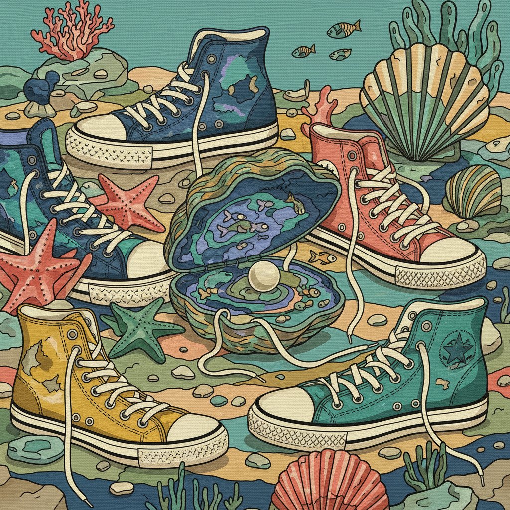 This unique artwork combines vintage sneaker culture with marine life elements, featuring realistic textures and turquoise ocean tones. The driftwood and waffle sole details create an eye-catching pop culture statement piece.