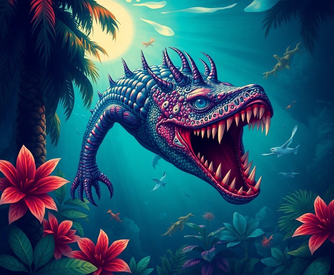 Ultimately, add fine details with your small brush to complete the awakening beast. The final result showcases a stunning creature that captures the essence of cinematic horror in brilliant tropical blues.