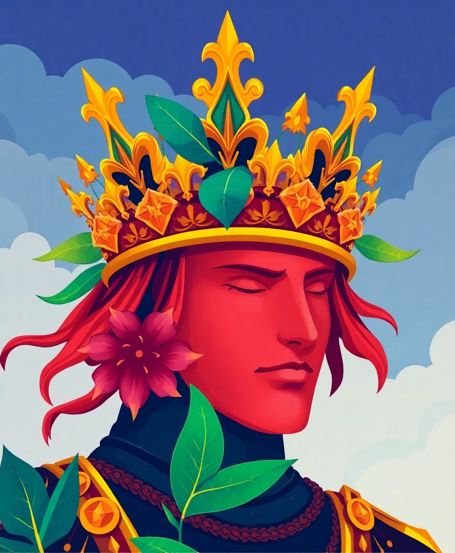 The unique combination of Arthurian legend with tropical botanical elements creates a distinctive artwork. The golden crown details and realistic styling make it a standout piece.