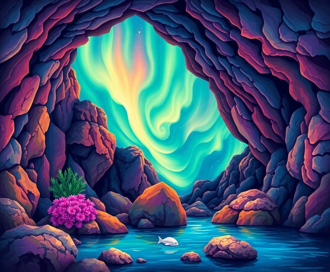 Ultimately, step back and admire your completed masterpiece as glowing aurora effects emerge. Furthermore, the tropical cave setting creates depth and mystery. Finally, your artistic achievement deserves prominent display in your home.