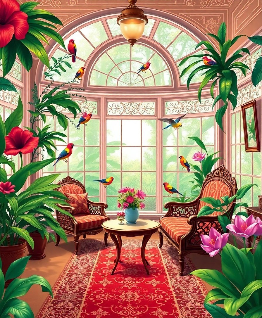 Ultimately, step back to admire your completed Victorian parlor scene. The mahogany furniture and exotic birds create a cozy indoor atmosphere that transforms any room into an elegant retreat.