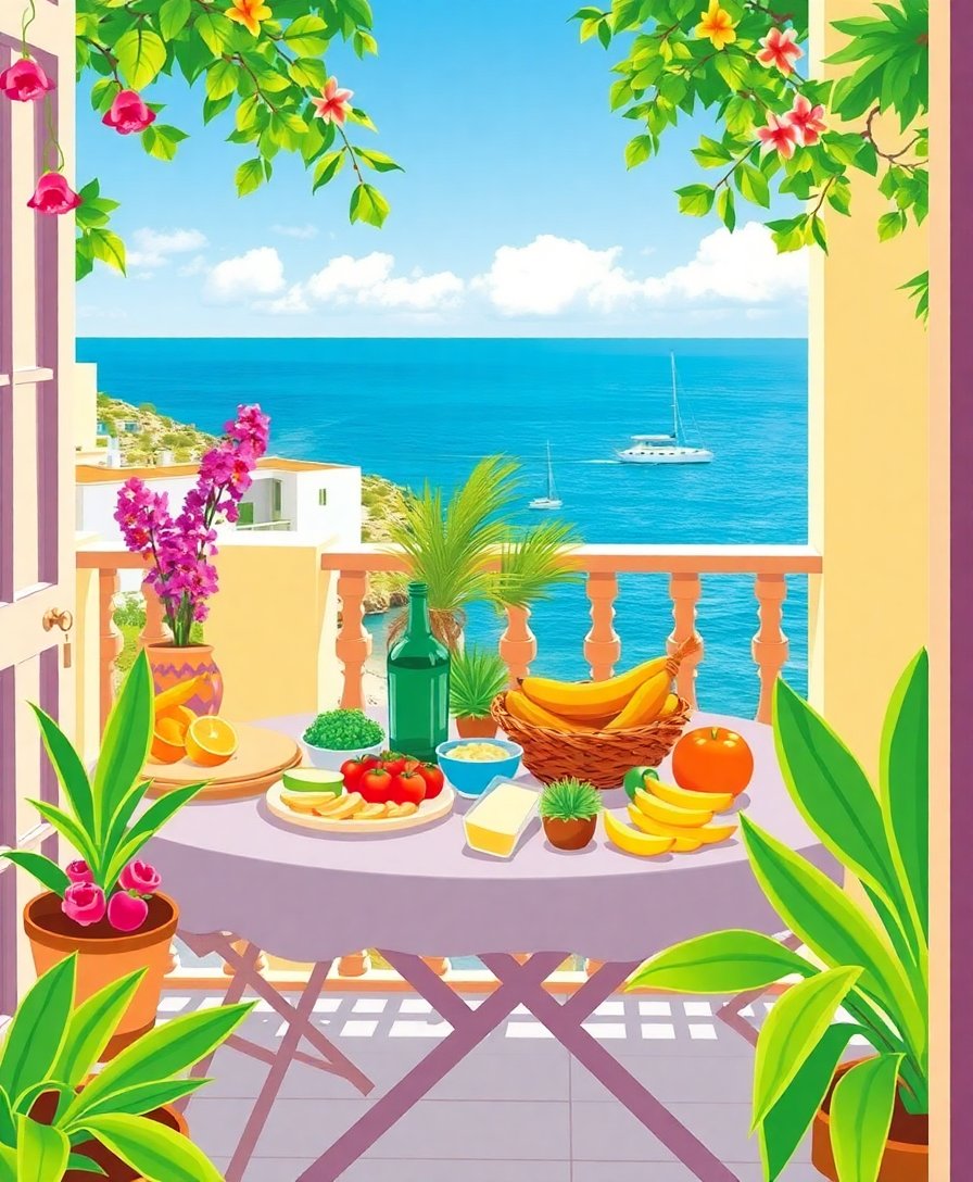 Transform your creative space with this stunning Tropical Balcony Food Spread Paint By Numbers kit. This vibrant artwork captures the essence of Mediterranean dining with lush foliage and breathtaking ocean views. Experience the joy of recreating this sun-drenched scene through relaxing brushstrokes.