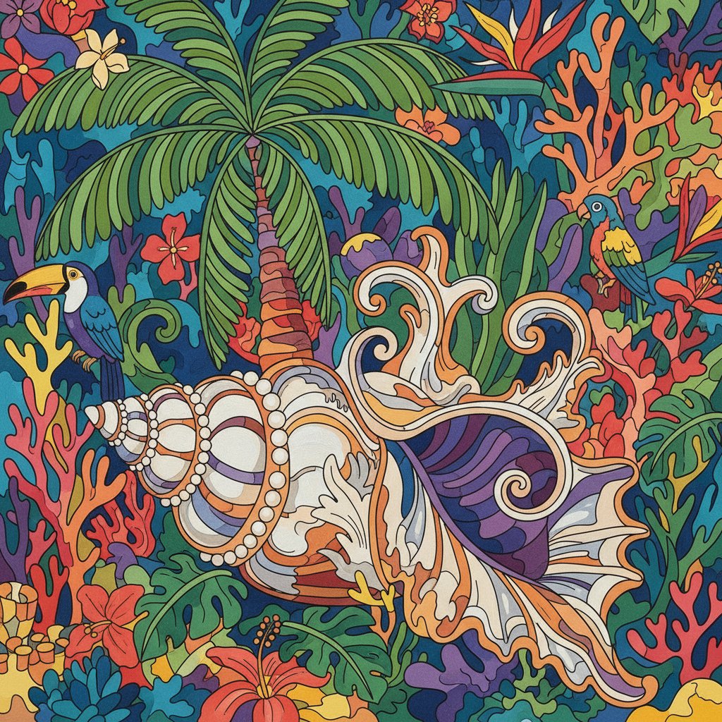 Transform your space with this stunning Tropical Baroque Conch Shell Paint By Numbers masterpiece. This sophisticated artwork combines baroque still life elegance with tropical elements. Experience the dramatic beauty of chiaroscuro lighting techniques through accessible paint by numbers artistry.