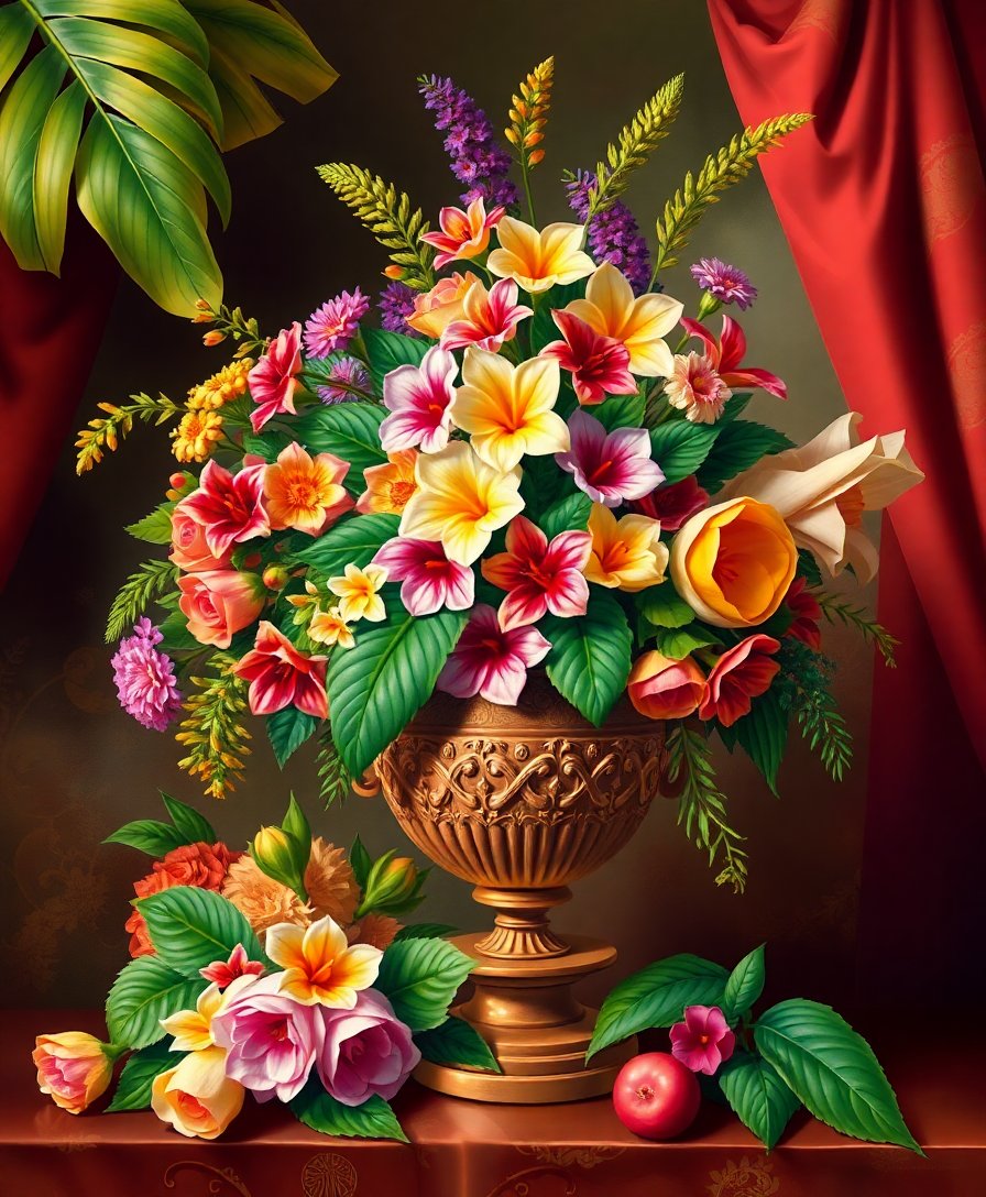Transform your space with this stunning Tropical Baroque Floral Urn Paint By Numbers kit. This sophisticated design combines lush tropical botanicals with classical baroque elegance. The rich, moody palette creates an atmosphere of timeless beauty.