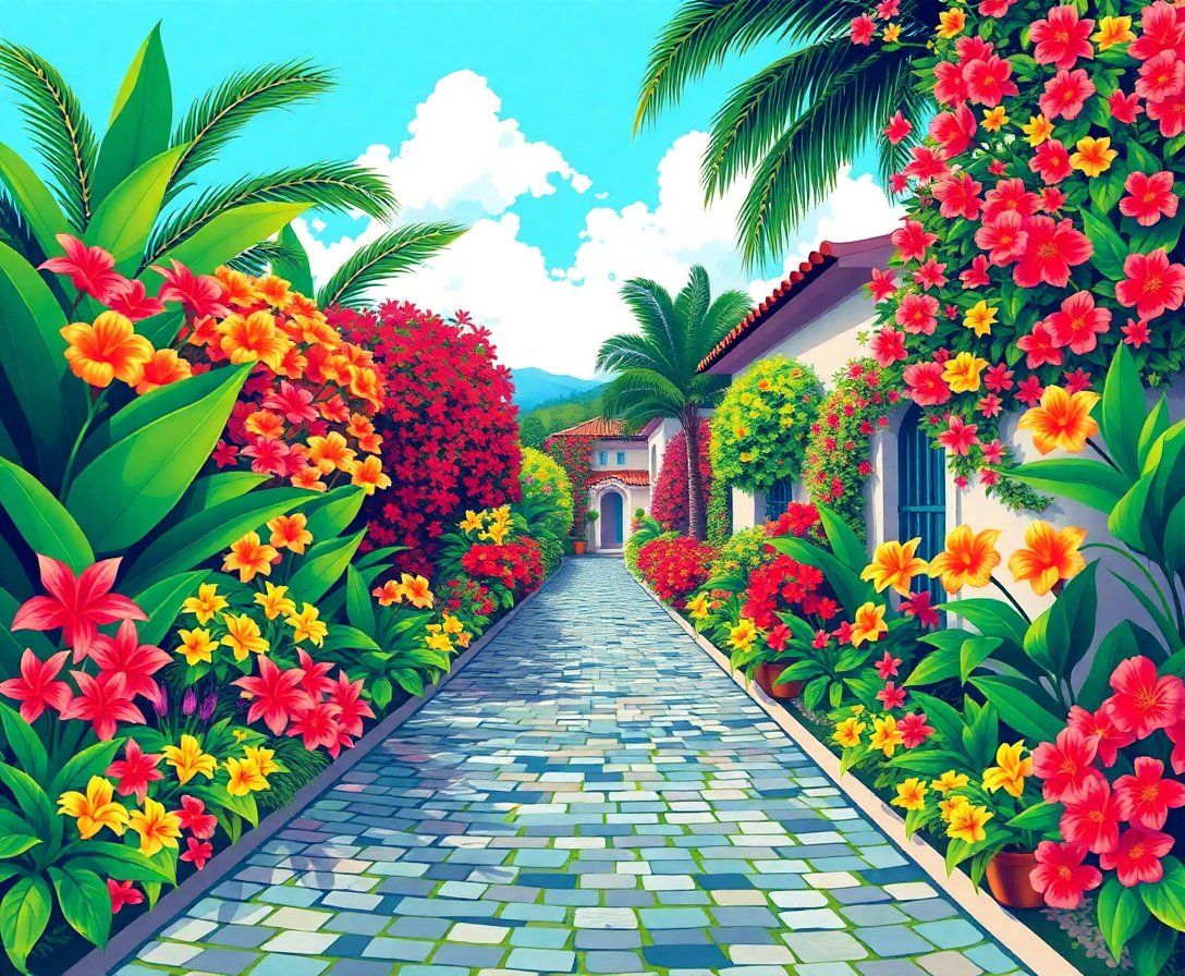 Transform your living space with the captivating Tropical Blooms Cobblestone Path Paint By Numbers, where vibrant florals meet charming European architecture. This stunning design combines the warmth of tropical flowers with the timeless appeal of cobblestone streets, creating a masterpiece that brings both color and culture to your walls.