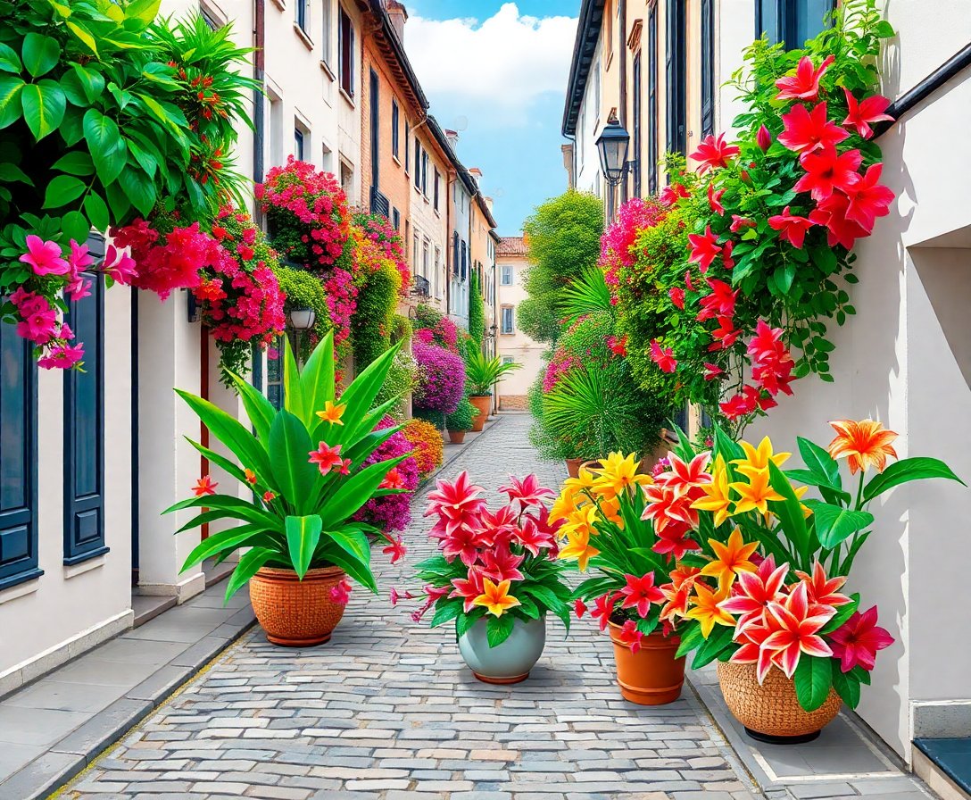 Ultimately, add final details with the small brush to enhance realistic textures. Furthermore, step back frequently to admire your developing masterpiece. The completed artwork showcases stunning tropical blooms against authentic cobblestone architecture.
