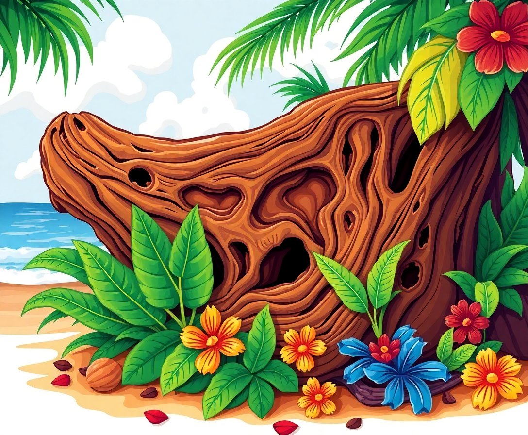Transform your space with this captivating Tropical Carved Wood Relic Paint By Numbers design. This stunning artwork captures the essence of weathered Polynesian craftsmanship, bringing island serenity to your home.