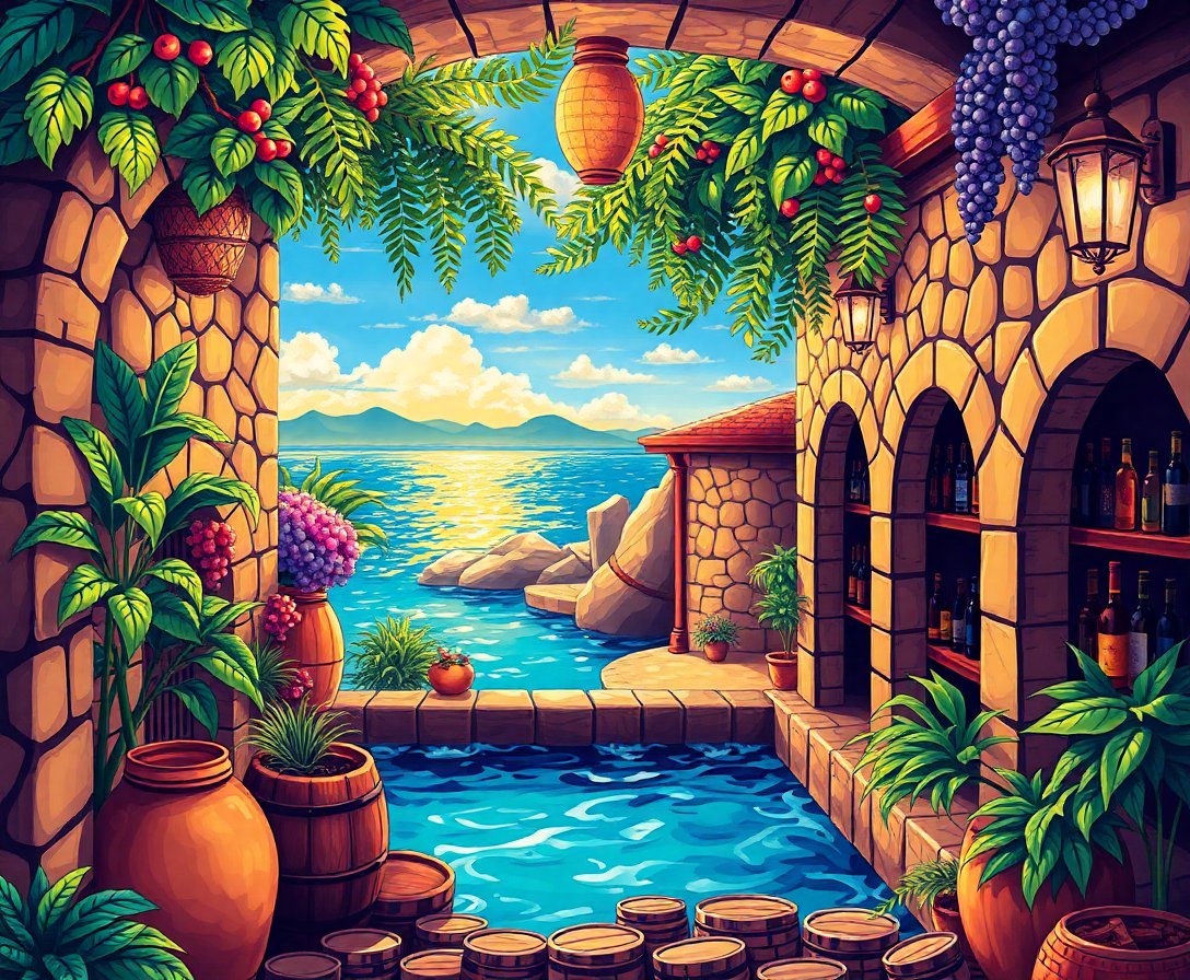Transform your space with this captivating Tropical Cellar Ocean Breeze Paint By Numbers masterpiece. This stunning artwork combines the rustic charm of an old world wine cellar with breathtaking ocean views, creating a unique tropical paradise scene. Additionally, the turquoise waters and cozy indoor atmosphere make this kit perfect for art enthusiasts seeking relaxation.