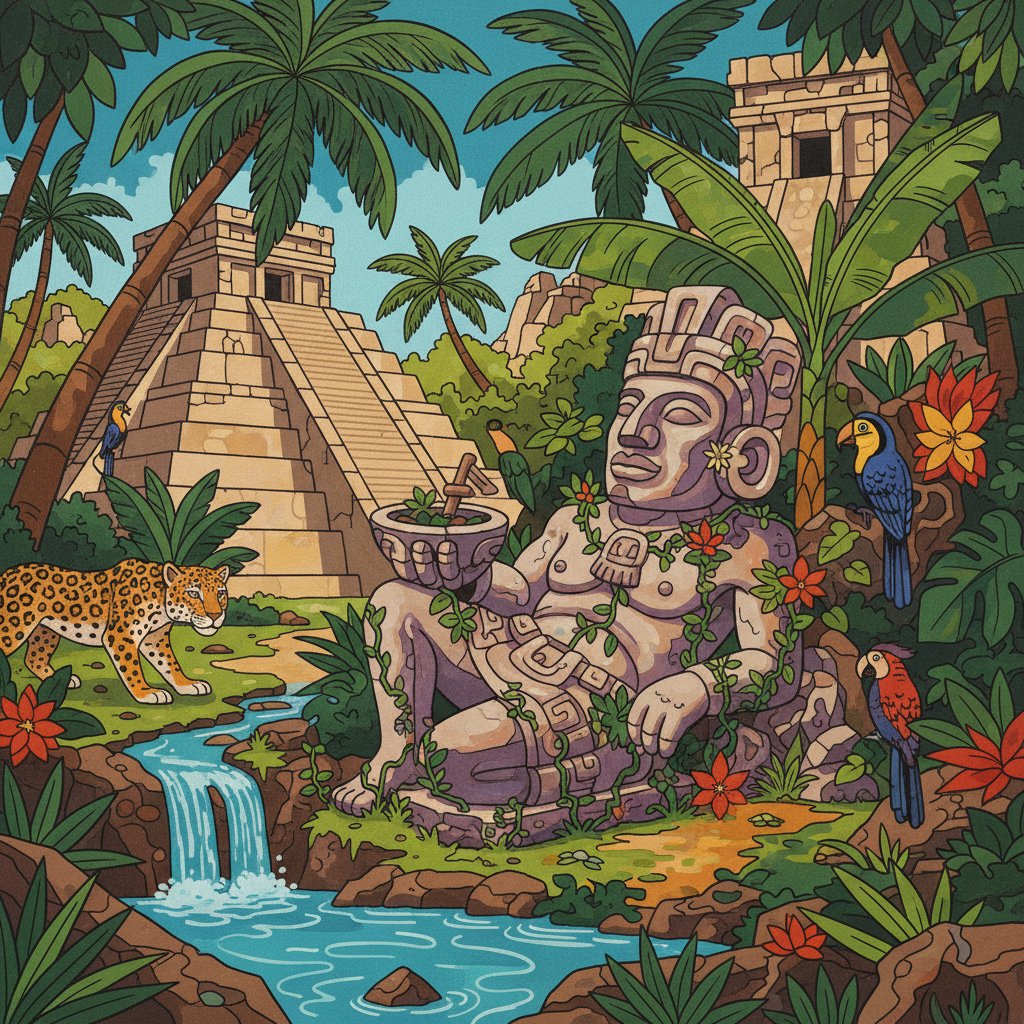 Ultimately, blend shadows and highlights to enhance sculptural depth. Add finishing touches to tropical foliage surrounding your Chac Mool figure. Your completed masterpiece captures both ancient grandeur and natural beauty magnificently.
