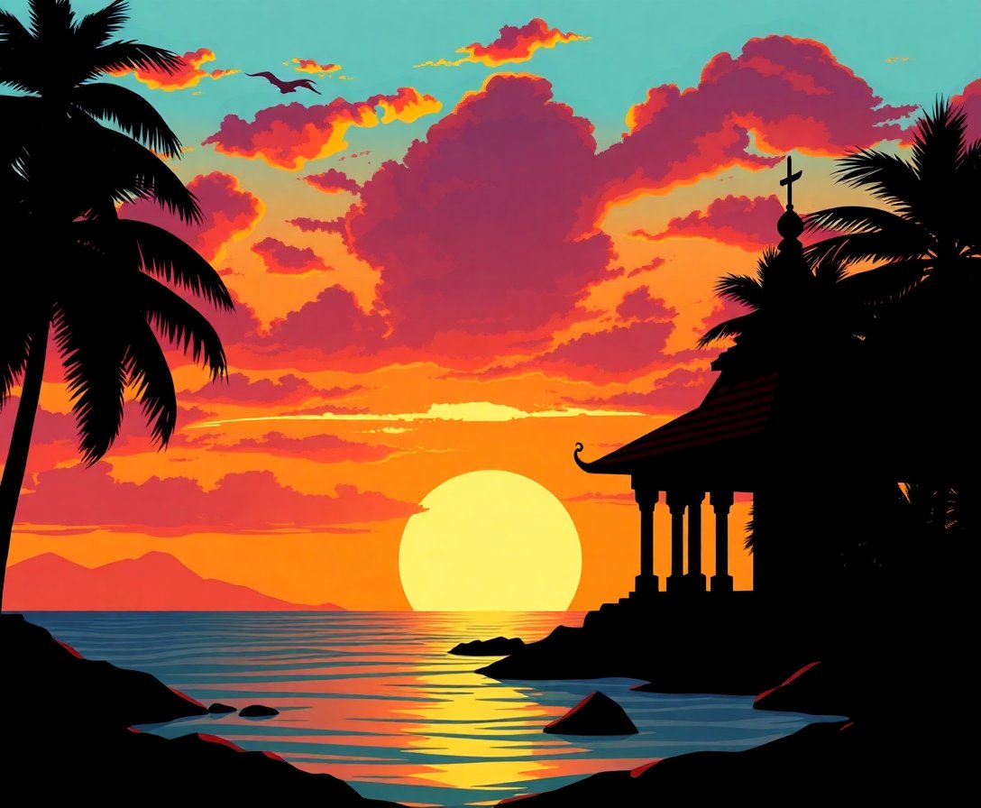 Transform your artistic space with this captivating Tropical Coast Temple Silhouette Paint By Numbers masterpiece. This stunning coastal scene captures the serene beauty of a temple silhouetted against vibrant twilight skies, bringing tropical tranquility to your home.