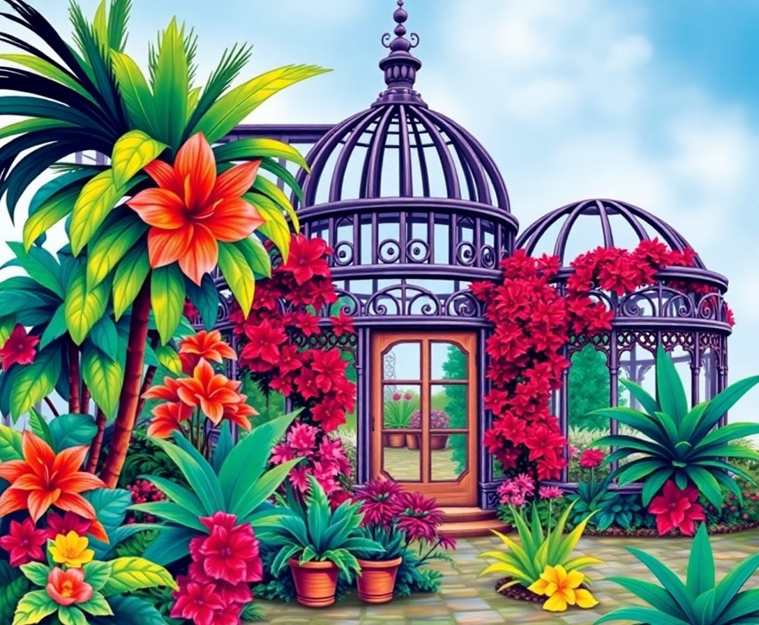 Ultimately, step back and admire your completed Victorian glasshouse scene. The intricate ironwork details bring architectural elegance to life. Therefore, your tropical conservatory artwork is ready for display.