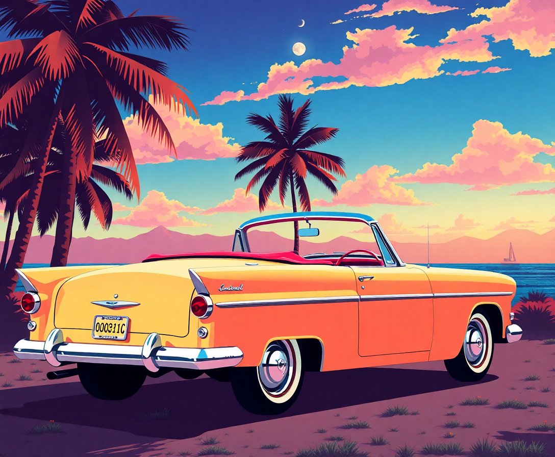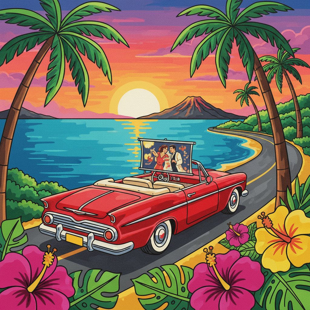 The completed painting measures standard poster size, perfect for displaying in living rooms, bedrooms, or entertainment spaces. The tropical convertible theme adds vibrant retro appeal anywhere.