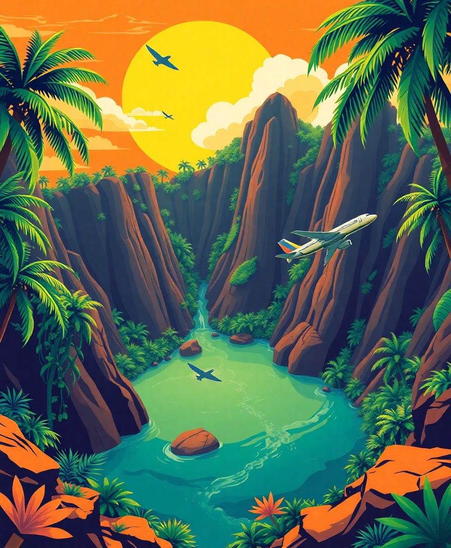 The canvas measures 16×20 inches, perfect for framing and displaying in any room. This size provides enough detail for the tropical crater and vintage aircraft elements.