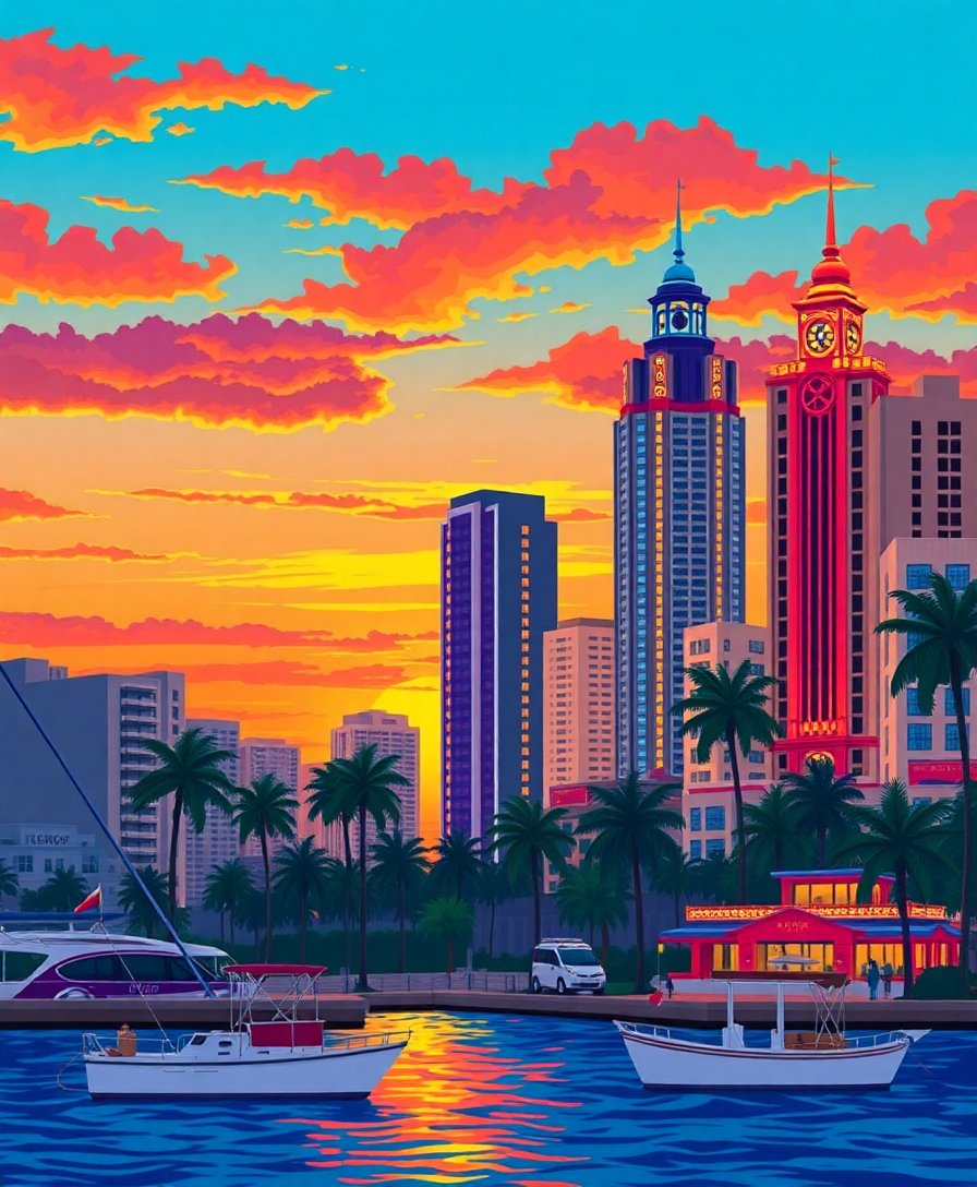 Transform your space with this stunning Tropical Deco Bay Sunset Paint By Numbers masterpiece. This captivating design combines vibrant tropical colors with elegant Art Deco architecture. Moreover, the sunset reflection creates a mesmerizing visual experience that brings sophistication to any room.