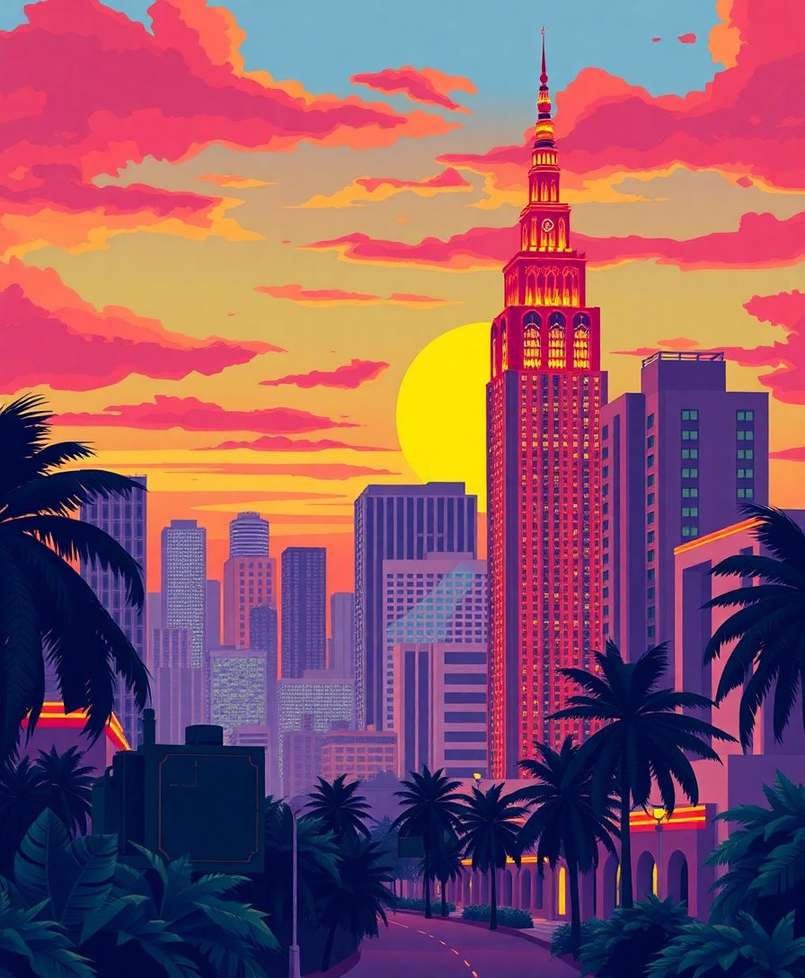 Ultimately, step back and admire your completed masterpiece. Furthermore, the finished piece showcases magnificent architectural details. Your tropical deco sunset skyline now radiates vintage charm and artistic elegance.