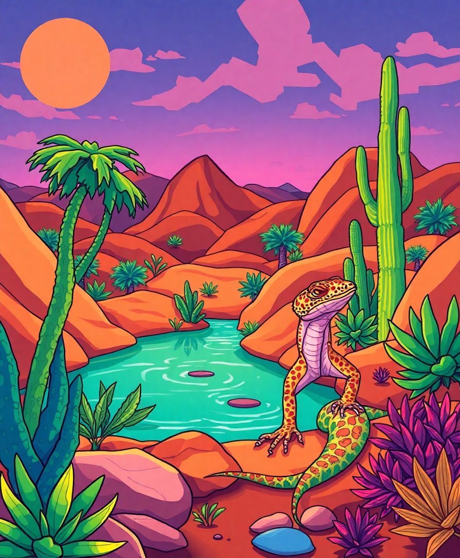 The unique contrast between lush tropical elements and desert wildlife creates a captivating visual experience. The exotic reptile details combined with vibrant oasis colors make this design truly distinctive.