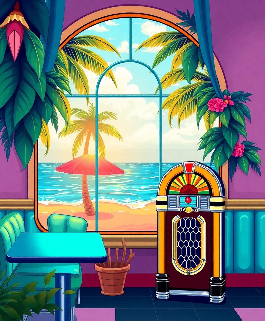 Embark on this artistic journey and bring the charm of a tropical diner to life. Moreover, each brushstroke connects you to the golden age of American classic diner jukeboxes and seaside dining.