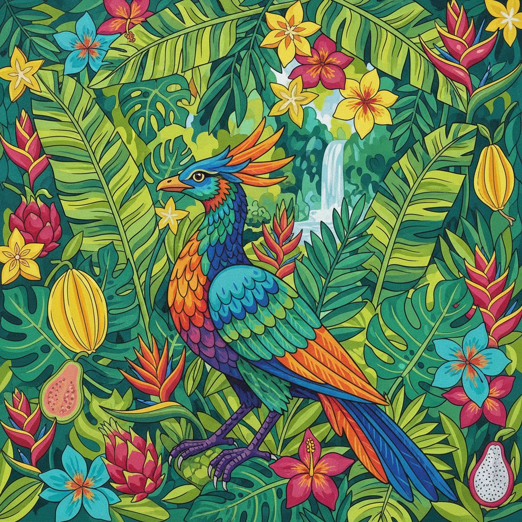 The canvas measures standard dimensions perfect for framing and wall display. The detailed design showcases intricate tropical and mythical elements beautifully.