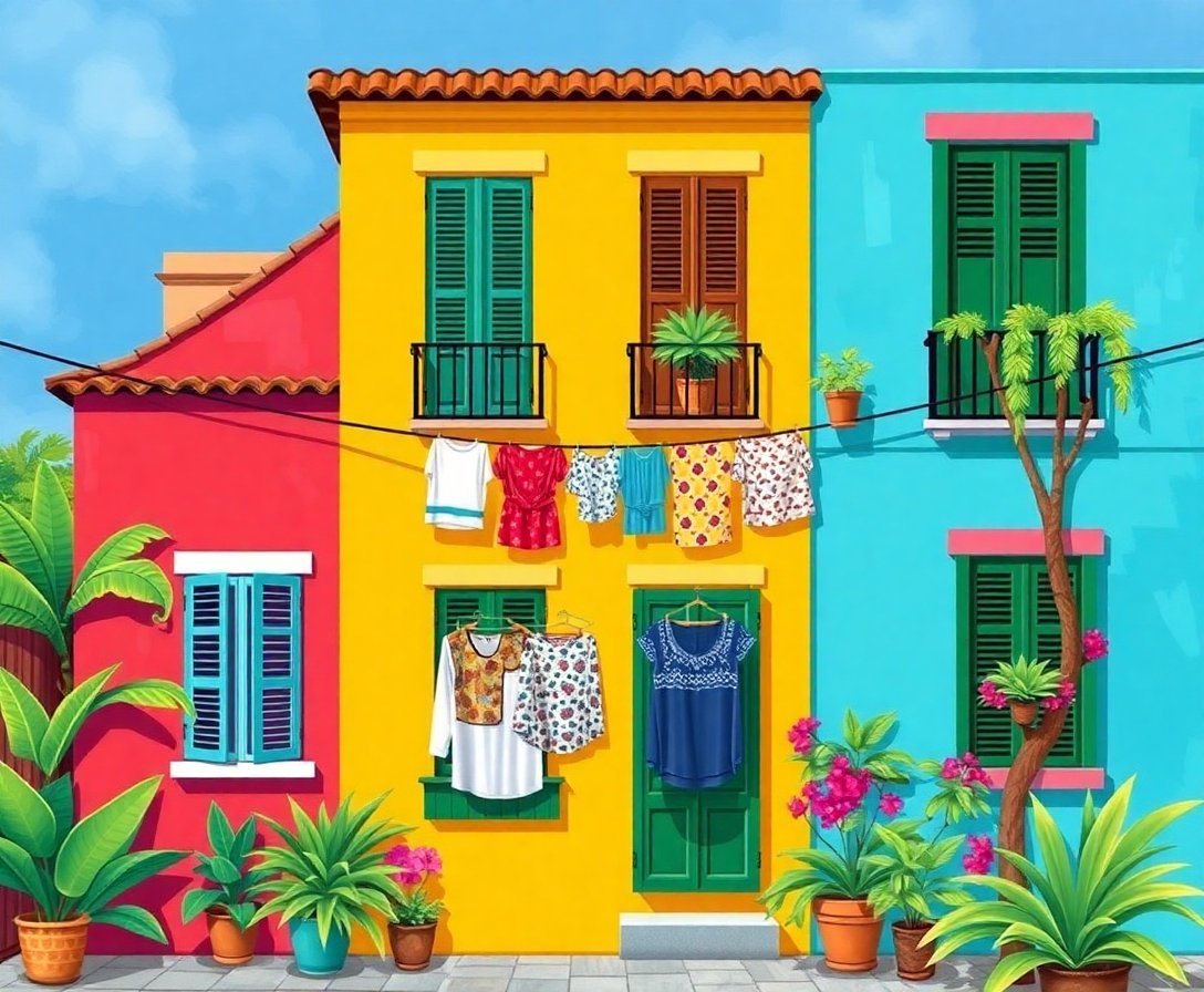 This kit captures the authentic charm of weathered colonial walls with colorful laundry lines. The vibrant tropical palette and architectural details create a unique piece that brings urban warmth to any space.