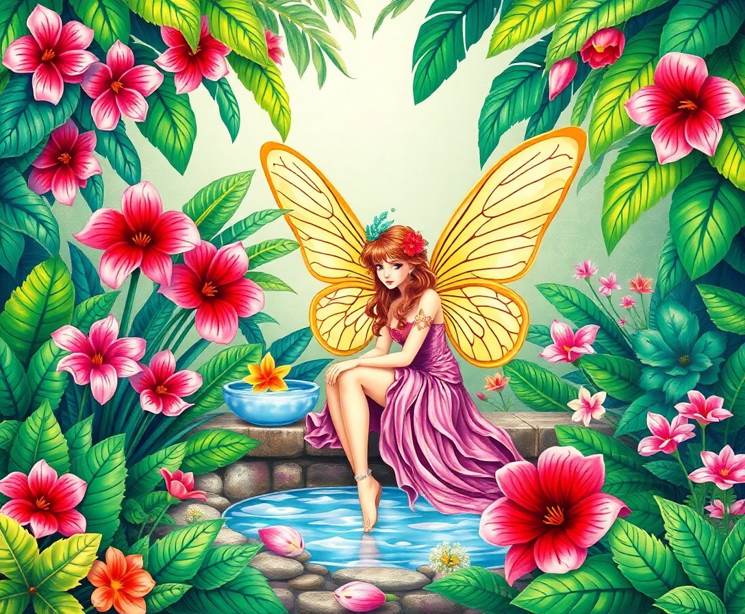 Ultimately, step back and admire your completed tropical fairy sanctuary. Furthermore, the realistic details and lush colors create an enchanting focal point. Finally, hang your artwork and enjoy the magical atmosphere it brings.