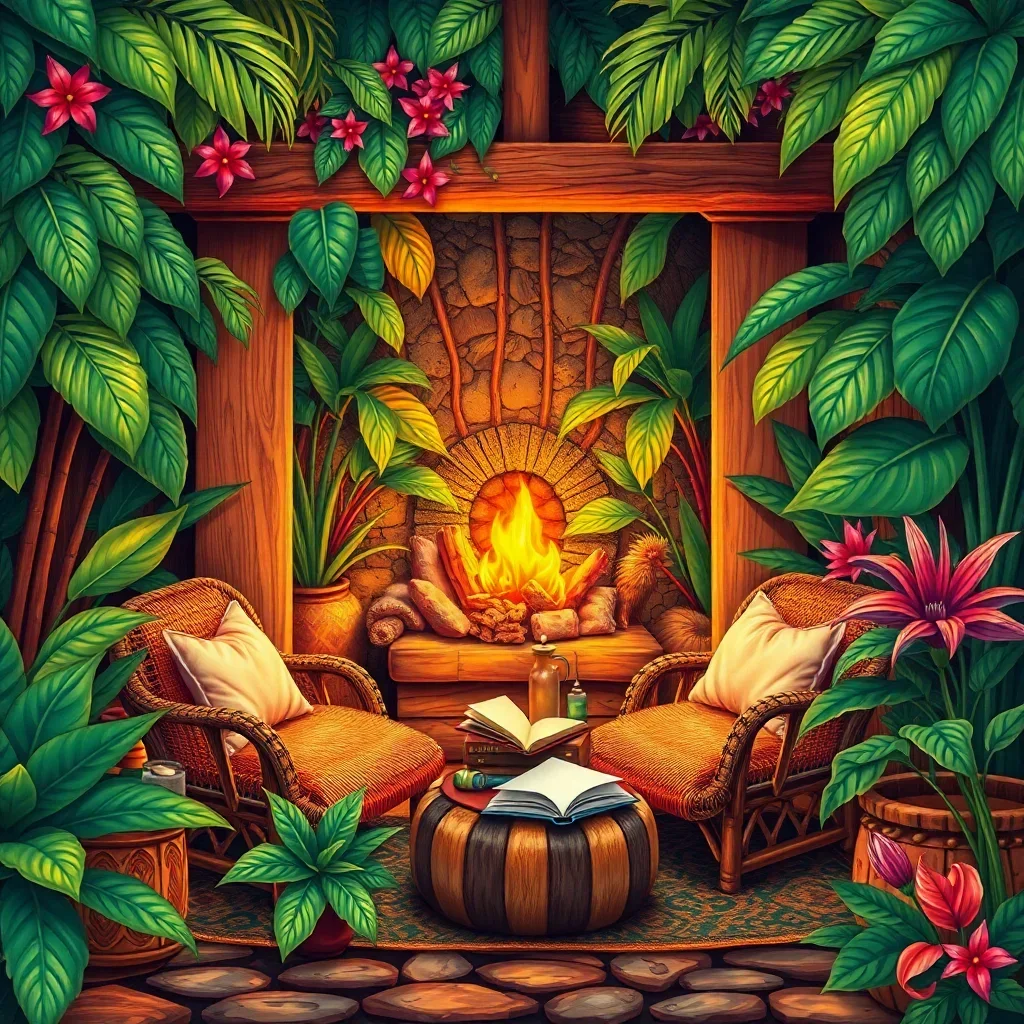 Transform your space with this enchanting Tropical Fireside Reading Nook Paint By Numbers kit. This captivating design blends cozy indoor comfort with lush botanical elements. Meanwhile, the tropical atmosphere creates a perfect harmony of warmth and relaxation.