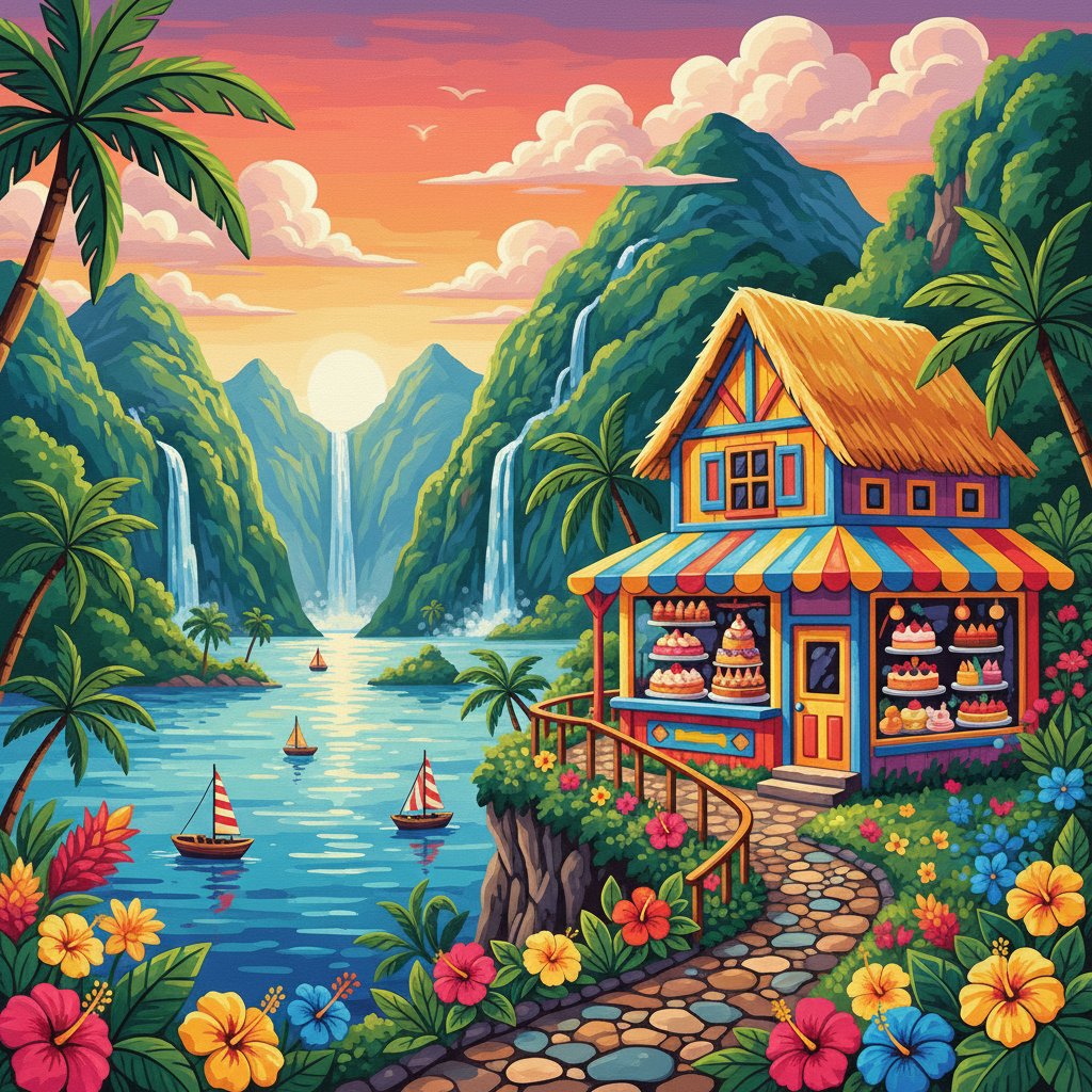 Transform your creative space with this stunning Tropical Fjord Pastry Shop Paint By Numbers masterpiece. This unique blend of Scandinavian charm and tropical paradise creates an enchanting scene. The vibrant bakery nestled among lush greenery offers hours of meditative painting pleasure.