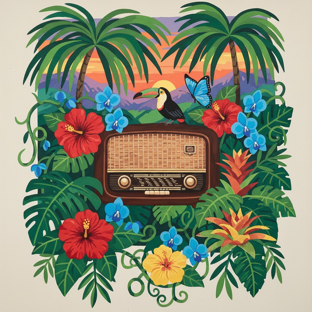 Ultimately, step back and admire your completed masterpiece. The vibrant tropical flora surrounding the vintage radio creates a stunning focal point that celebrates both retro aesthetics and natural beauty.
