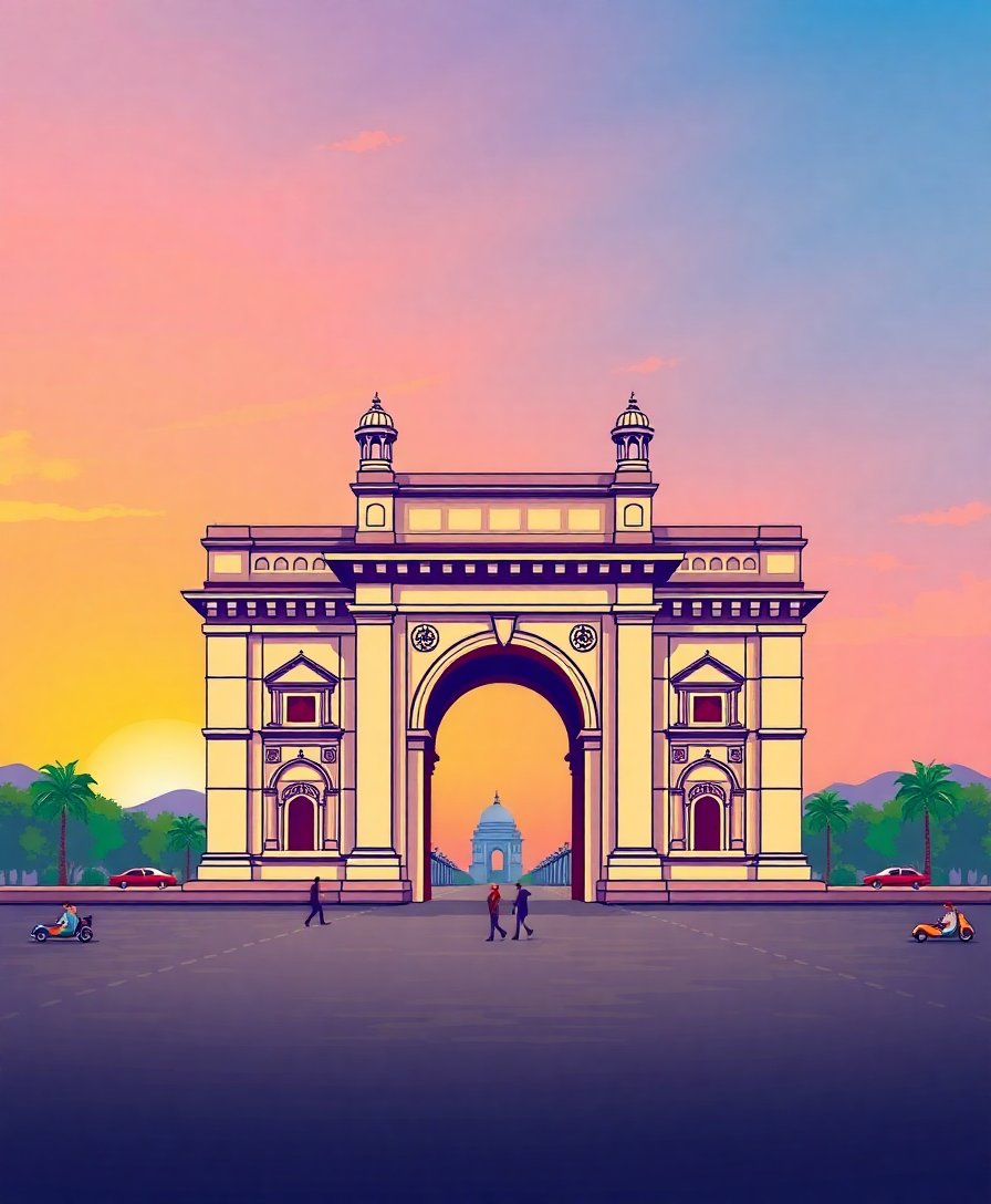 Ultimately, step back and admire your finished creation. Add final touches with the small brush for intricate details. Your completed artwork showcases Mumbai’s majestic gateway in tropical splendor.