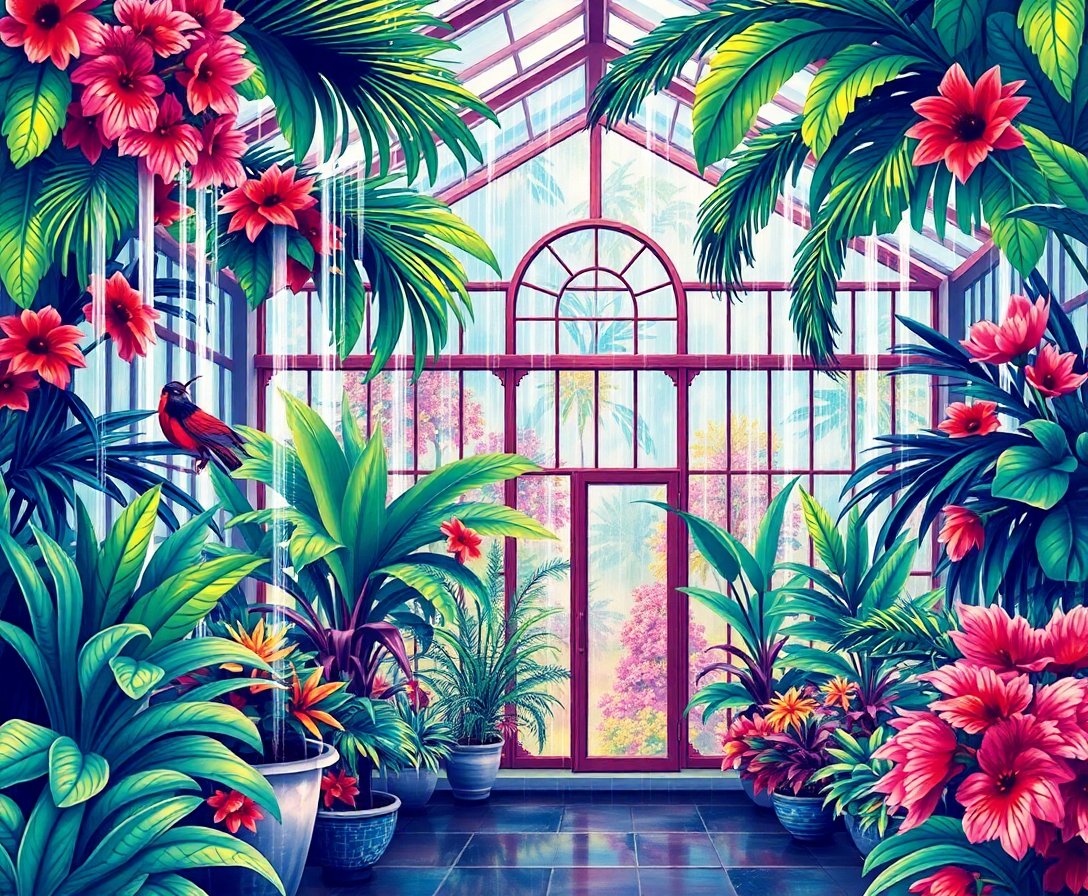 Begin your creative journey today with this captivating Tropical Glasshouse Rain Showers paint by numbers kit. Additionally, discover the joy of bringing atmospheric greenhouse architecture to life through art.