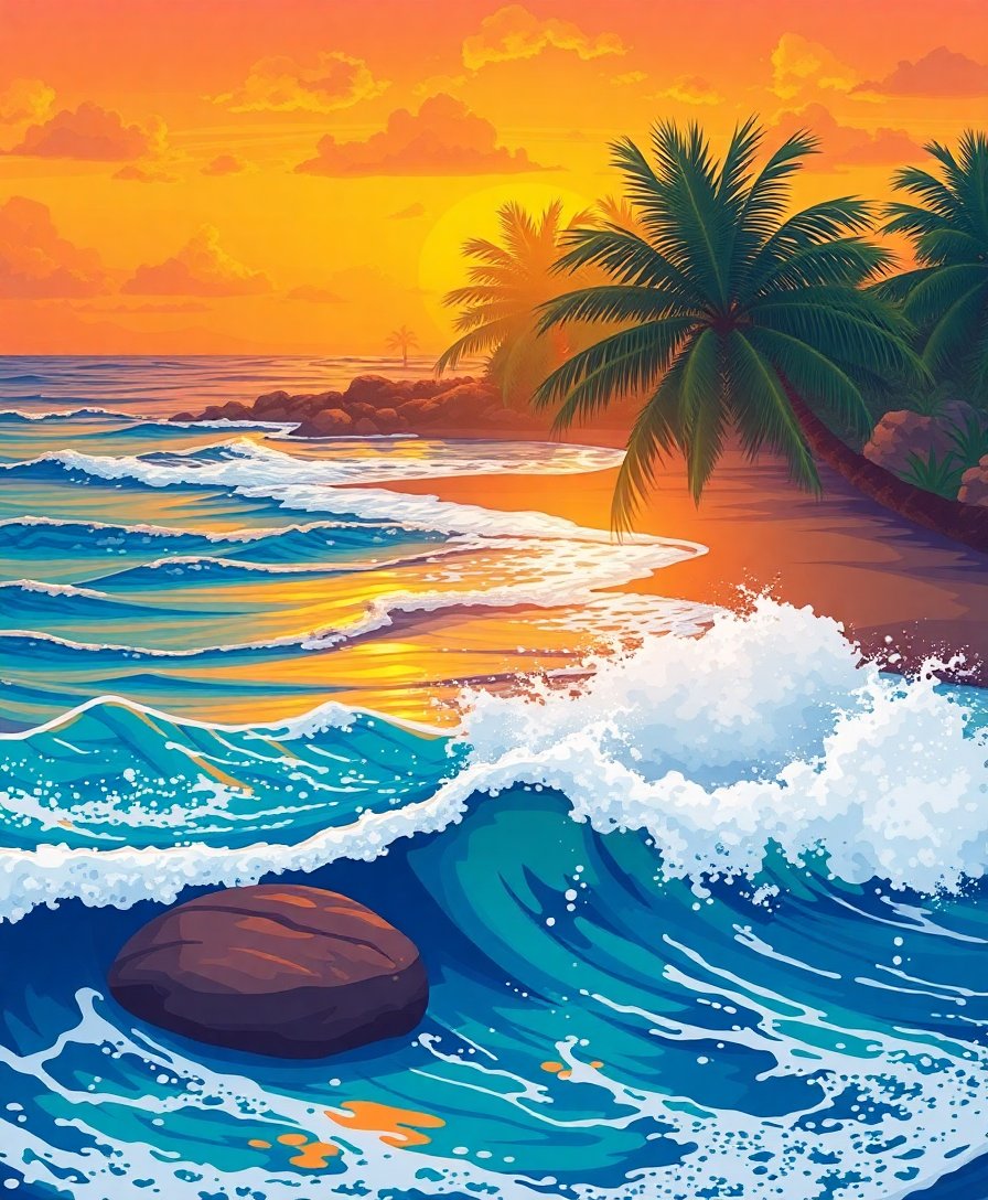 Transform your creative space with this stunning Tropical Golden Hour Surf Paint By Numbers kit. This breathtaking scene captures amber sunlight dancing across ocean waves while surfboards rest on pristine tropical shores. Each brushstroke brings you closer to creating your own beach masterpiece.