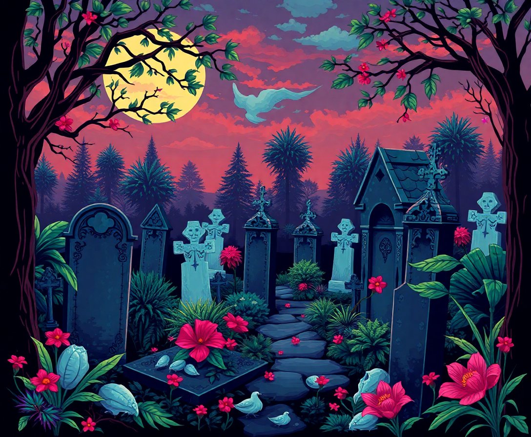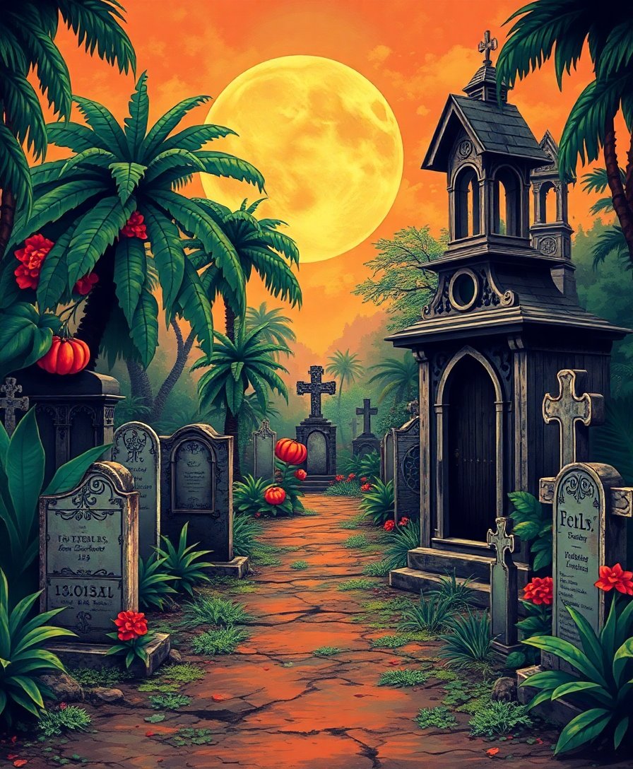 Ultimately, step back and admire your completed tropical gothic scene. The contrast between tropical vegetation and eerie cemetery creates stunning visual impact. Your finished piece radiates mysterious beauty.