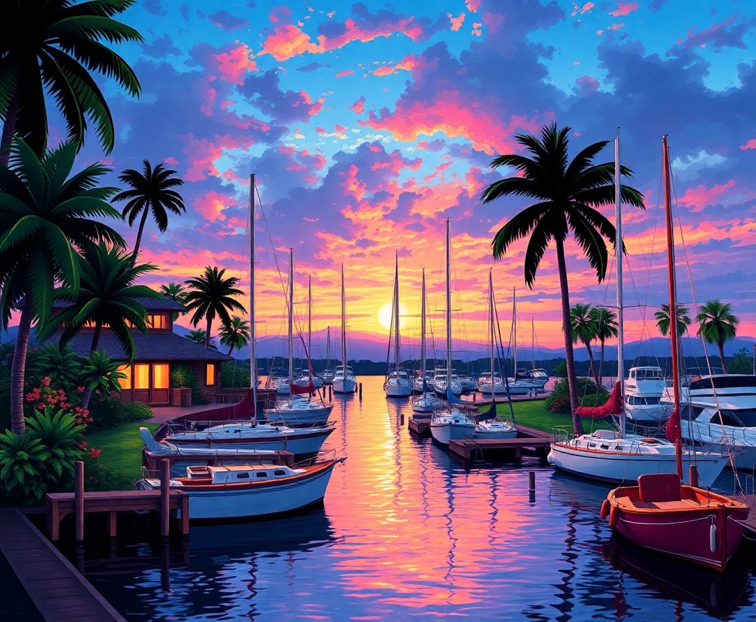 Ultimately, step back and admire your completed masterpiece as evening colors come alive. Consequently, your tropical harbor scene radiates warmth and tranquility. Display your finished artwork proudly as a testament to your artistic achievement.