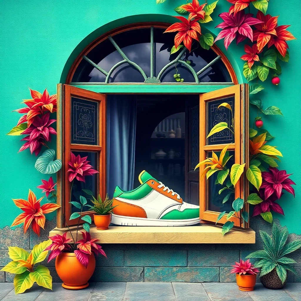 Ultimately, step back and admire your completed artwork. The vibrant tropical colors and retro sneaker details create a stunning window scene that celebrates both art and culture.