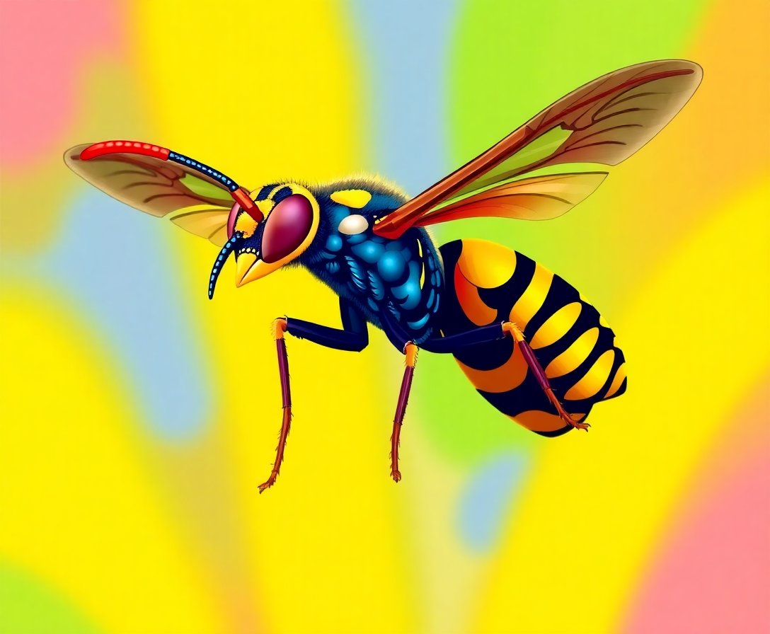 This design showcases the intricate wing patterns and iridescent coloring that makes tropical hawk wasps so captivating. The detailed artwork celebrates natural history in stunning visual form.