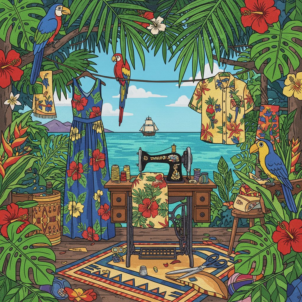 Transform your creative space with the enchanting Tropical Heritage Tailor Nook Paint By Numbers. This stunning artwork captures the essence of a vintage tropical seamstress sanctuary. Meanwhile, lush greenery frames antique tailoring tools in perfect sepia harmony.