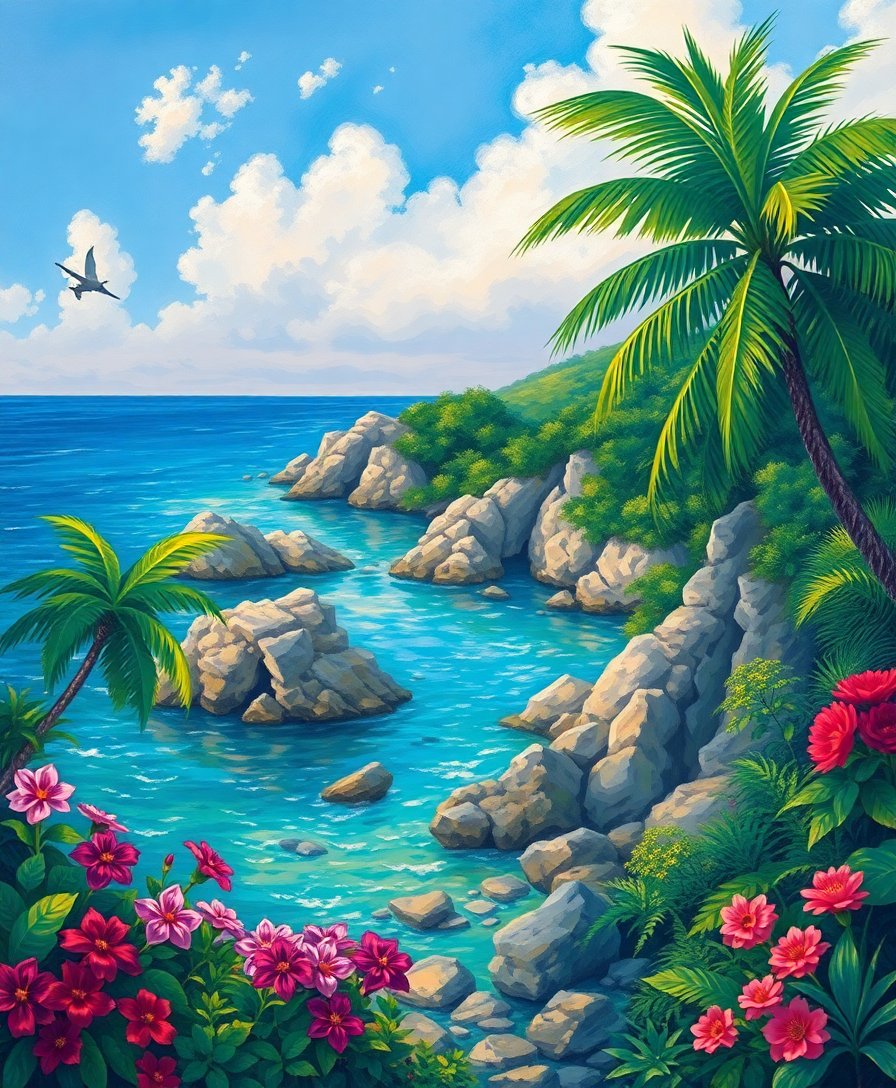 Ultimately, step back and admire your completed tropical sanctuary. The overgrown vegetation and shimmering cove waters create a captivating focal point. Your artistic achievement deserves prominent display in your favorite room.