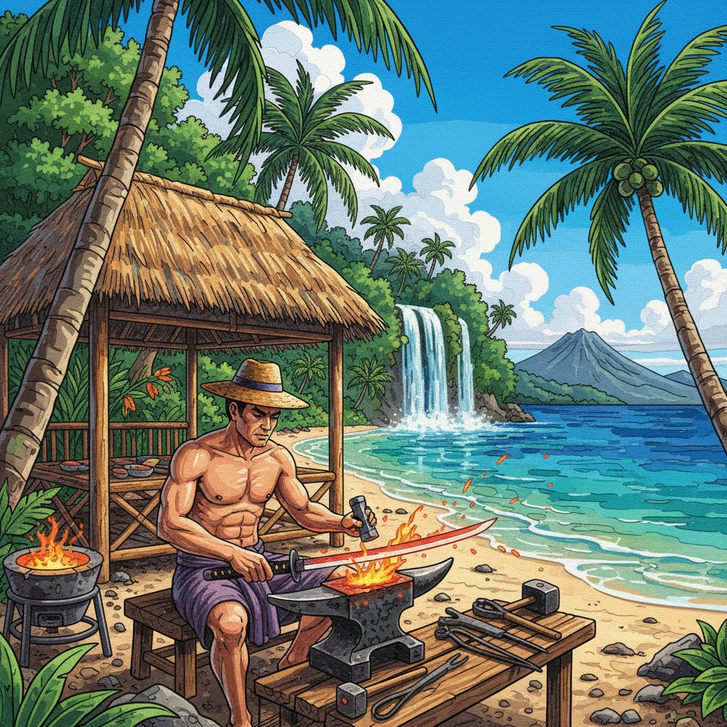 Ultimately, step back and admire your finished masterpiece showcasing feudal craftsmanship. Additionally, the vibrant tropical setting perfectly complements the historical blacksmith scene. Therefore, your completed artwork becomes a stunning conversation piece.