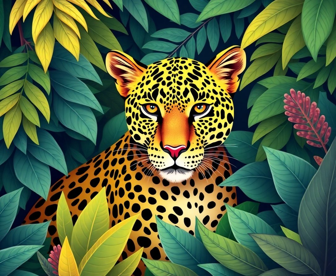 Ultimately, add final highlights to the leopard and soft accents to the surrounding ferns. Then step back and admire your glowing, vintage safari feline scene. You may even share your result alongside inspiring gallery wall ideas for extra display inspiration.