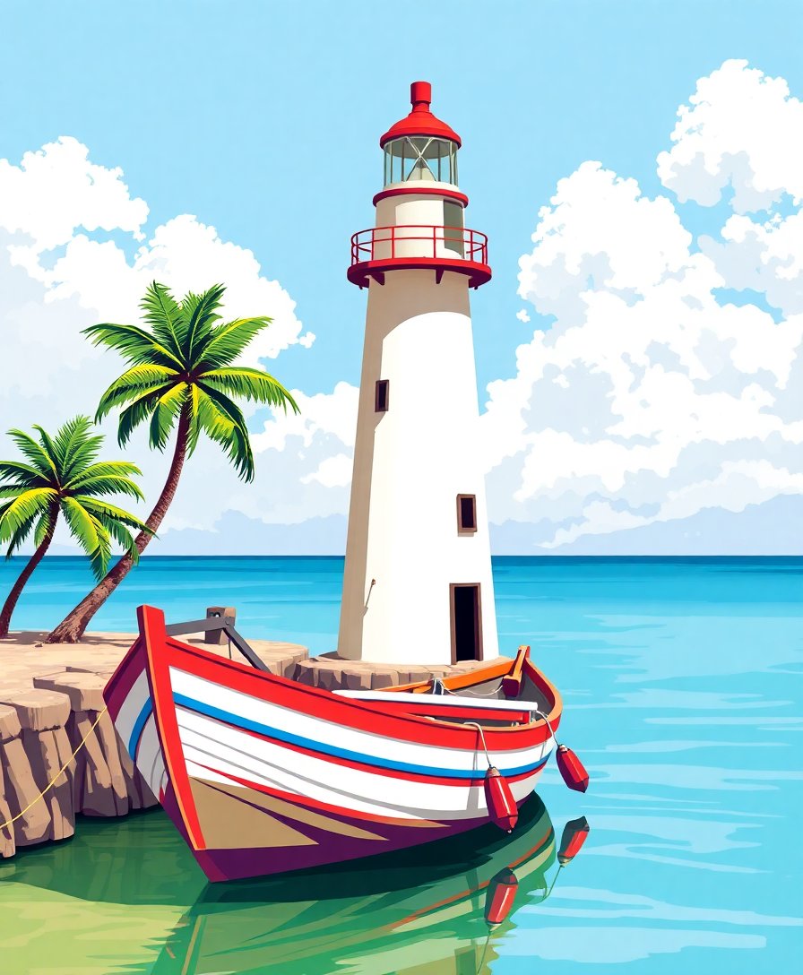Transform your artistic vision into reality with this breathtaking Tropical Lighthouse Moored Skiff Paint By Numbers masterpiece. This captivating seascape combines turquoise waters, a rustic lighthouse, and a charming rowboat in perfect harmony. Additionally, the lush tropical setting creates an inspiring painting experience that transports you to paradise.