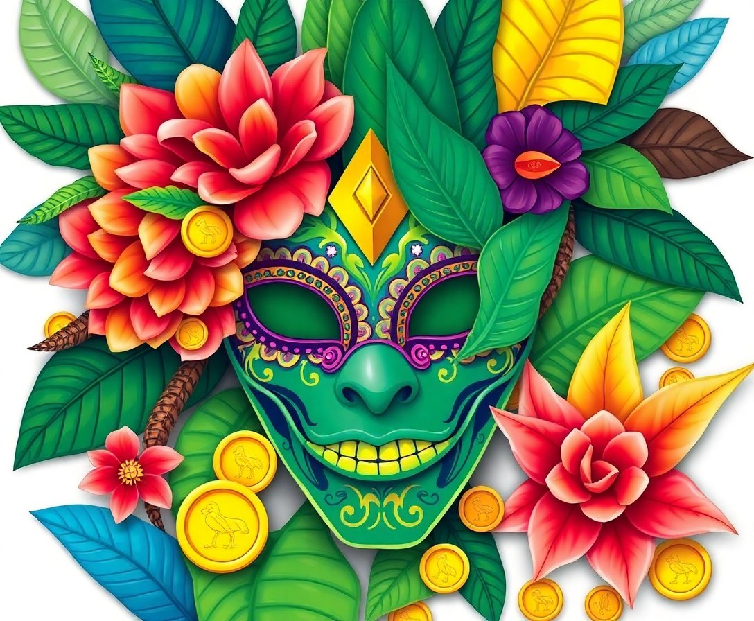 Ultimately, complete the intricate masquerade details and purple accents that bring depth to your creation. Your finished Tropical Masquerade Coin Hoard Paint By Numbers artwork radiates festive energy and tropical charm.