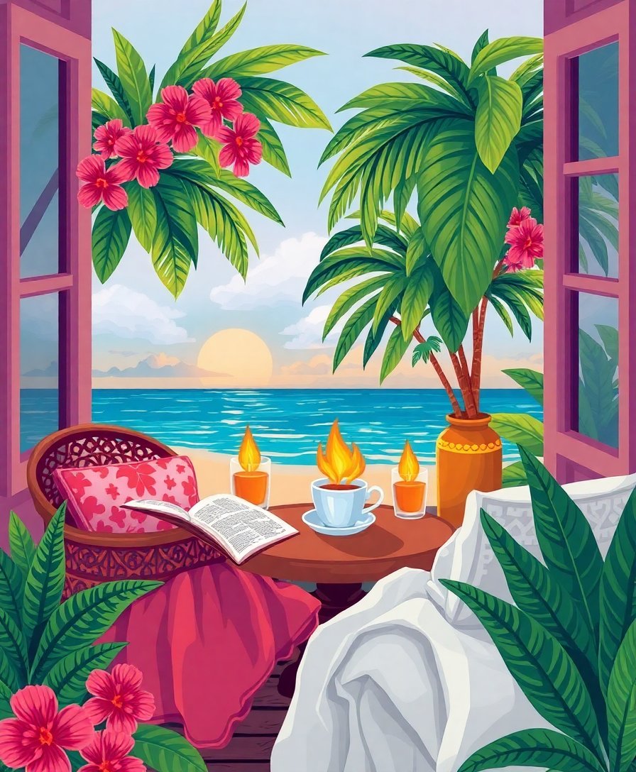The nostalgic combination of tropical elements with cozy teatime memories creates a unique artistic experience. The vintage diary aesthetic adds warmth and character to any space.